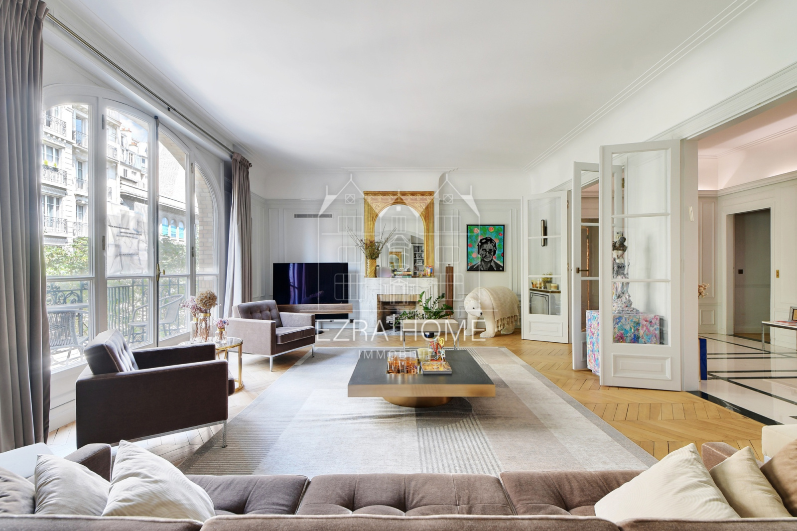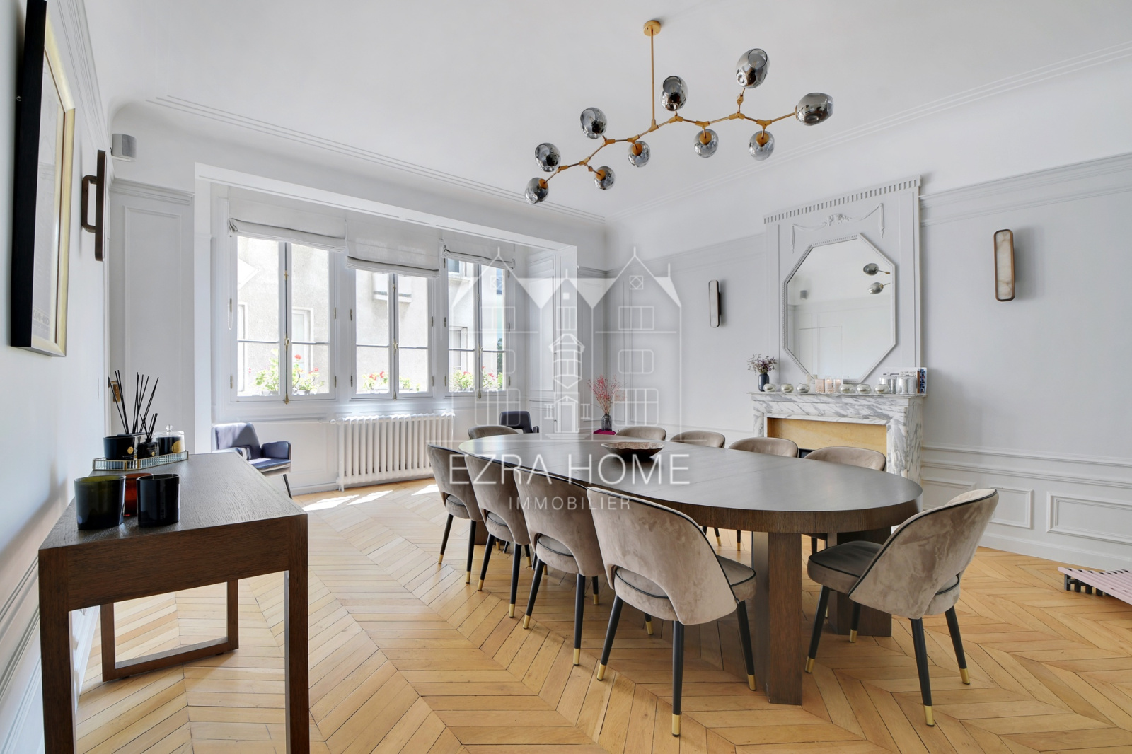 Situé au 5e étage d’un immeuble Art Déco avec ascenseur et gardien, cet appartement de 336,15 m² offre de superbes volumes et tout le charme de l’ancien : hauteur sous plafond, parquet en point de Hongrie, moulures élégantes et cheminées d’époque.