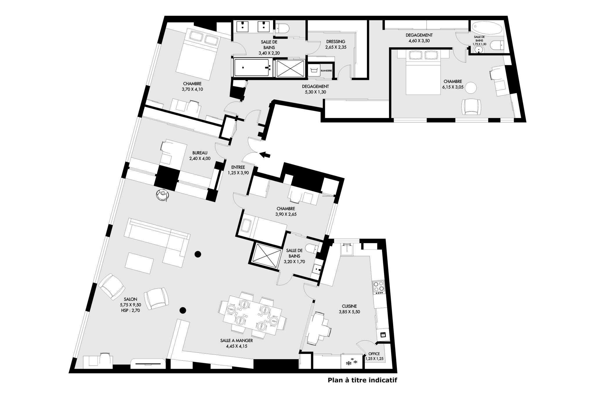 Côté nuit l’appartement est aménagé en 4 chambres (possible 5) avec 3 salles de bains/douche : une grande suite parentale avec salle de bain+douche en-suite, WC et dressing, plus trois autres chambres (1 actuellement en usage bureau), avec deux salles de bain/douche avec WC, et d'un coin buanderie.