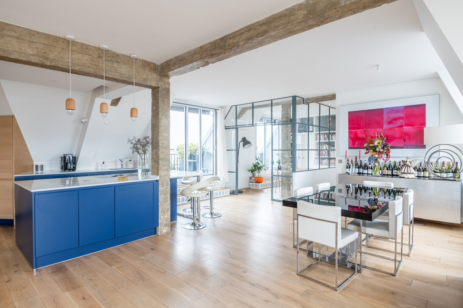 Il offre un bel espace de vie climatisé, sublimé par une terrasse panoramique de 96 m² offrant une vue imprenable sur la Tour Eiffel et le Dôme des Invalides.
