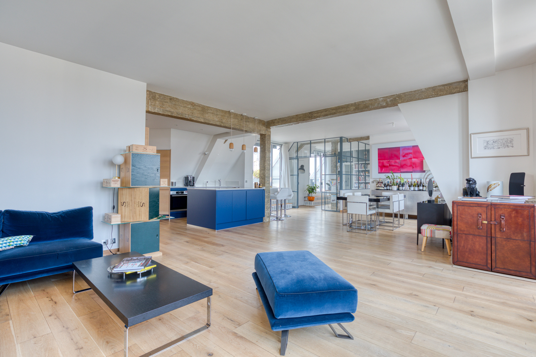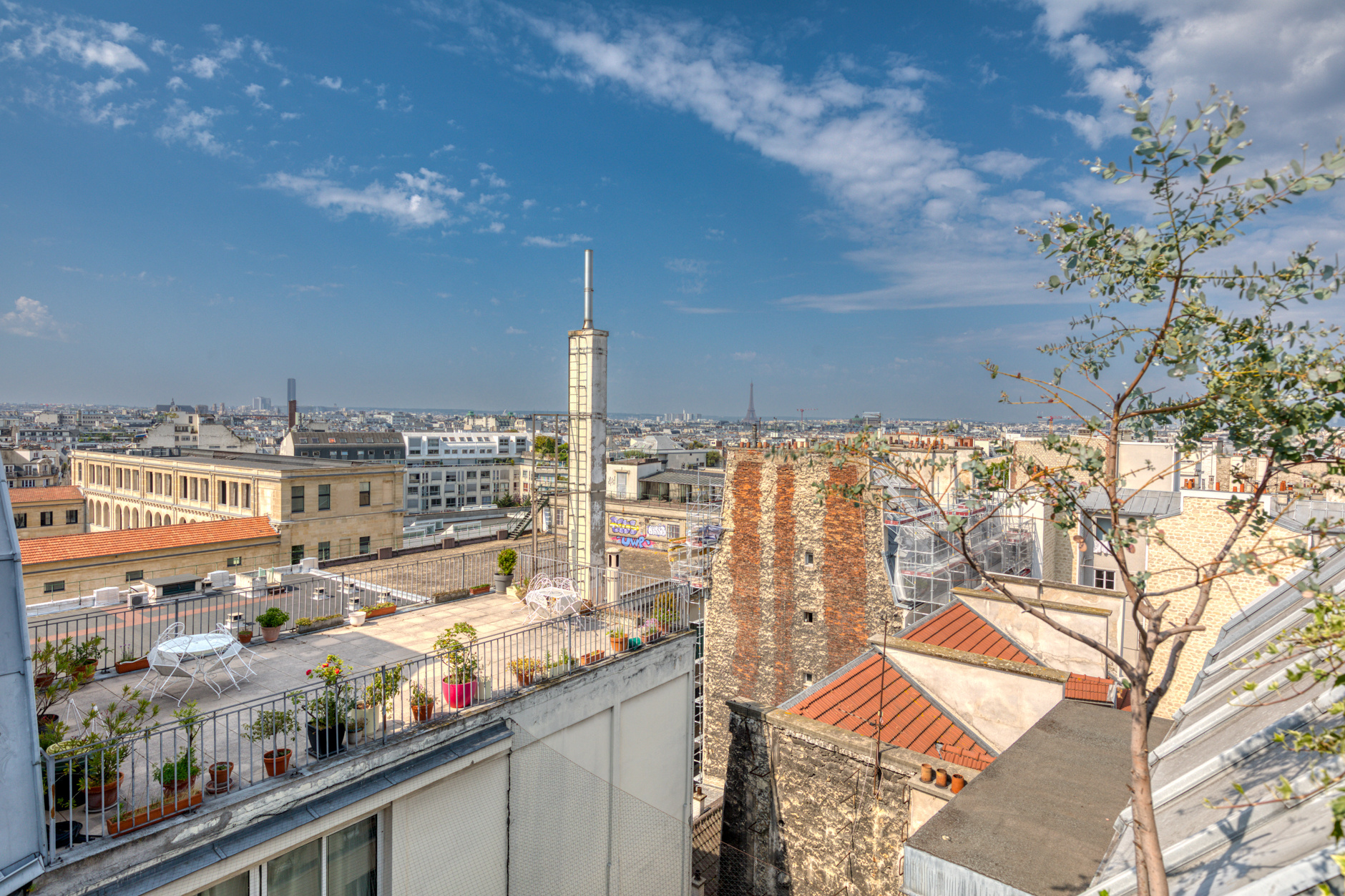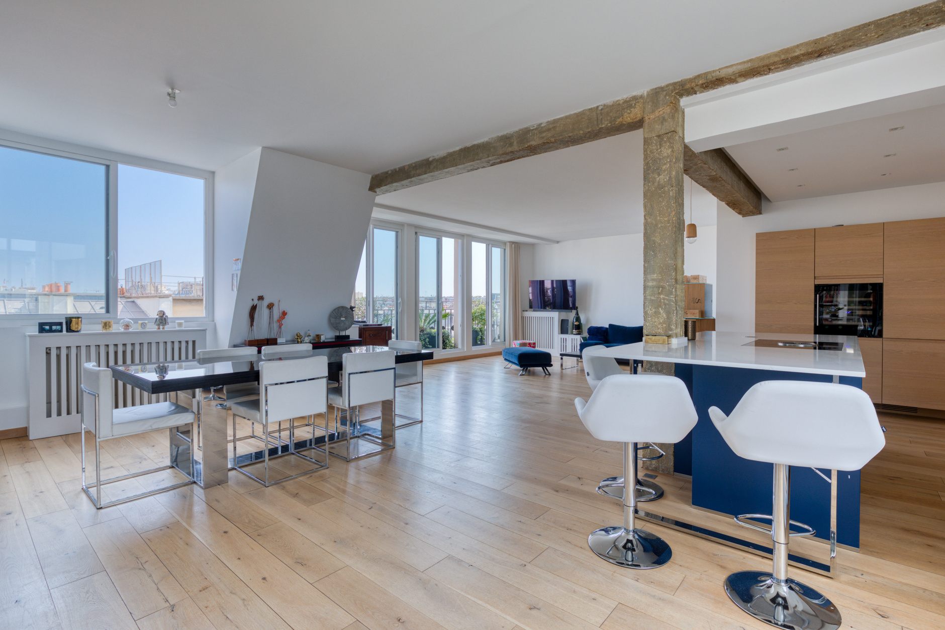Le séjour s’ouvre en harmonie sur la terrasse de 96 m², un véritable havre de paix en plein cœur de la ville, offrant une intimité totale, sans vis-à-vis, et une vue spectaculaire sur les monuments et les toits de Paris.