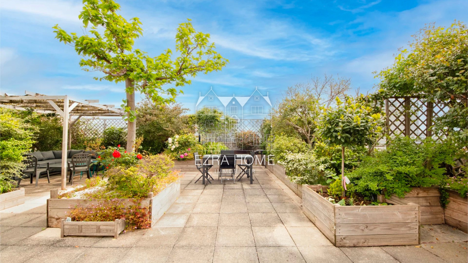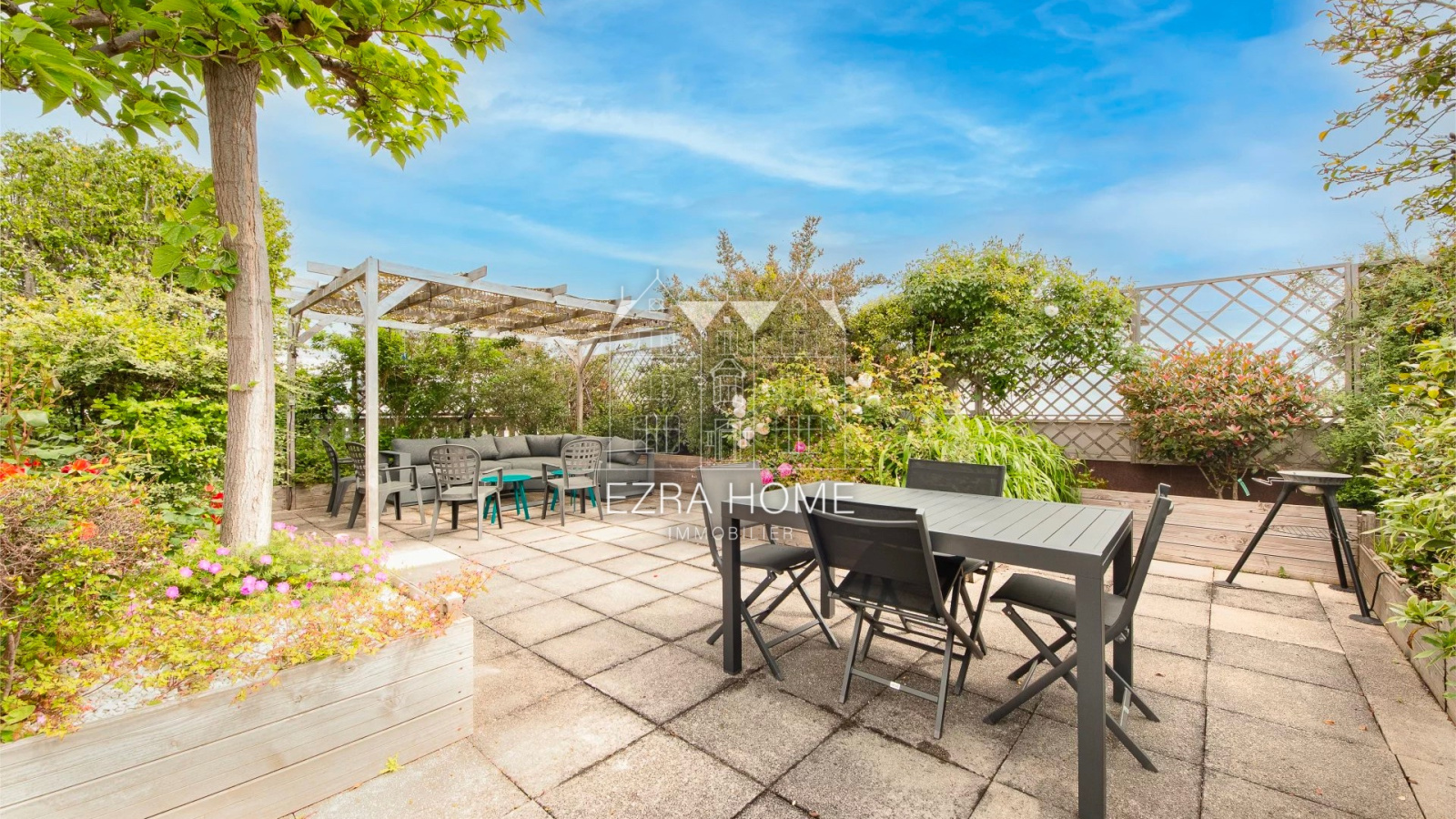 Le 6ème étage, La salle à manger s'ouvre en harmonie sur la terrasse de 158 m², Arborée et dotée d'un système d'arrosage automatique, "un havre de paix en plein cœur de la ville", offrant une intimité totale sans vis-à-vis.